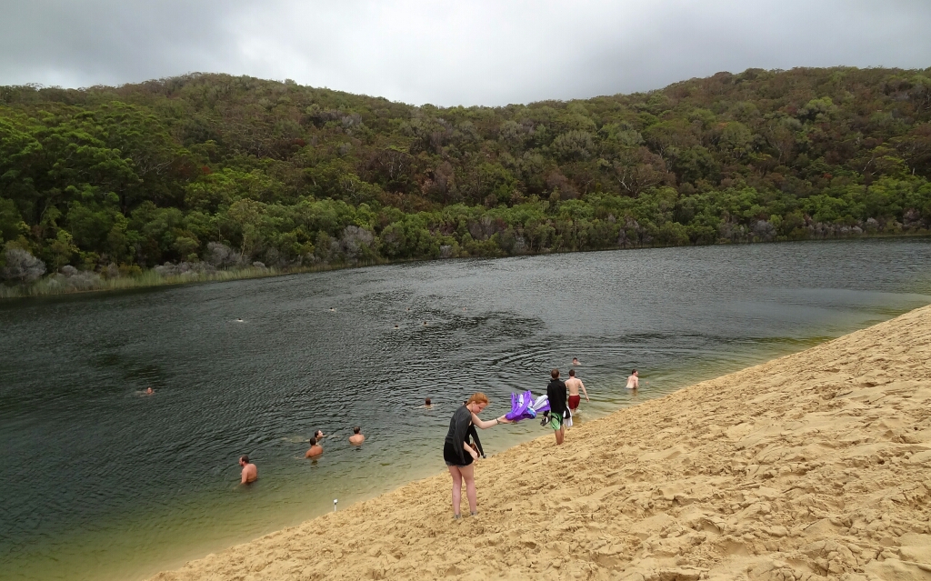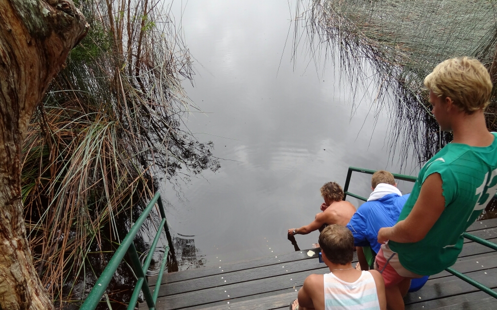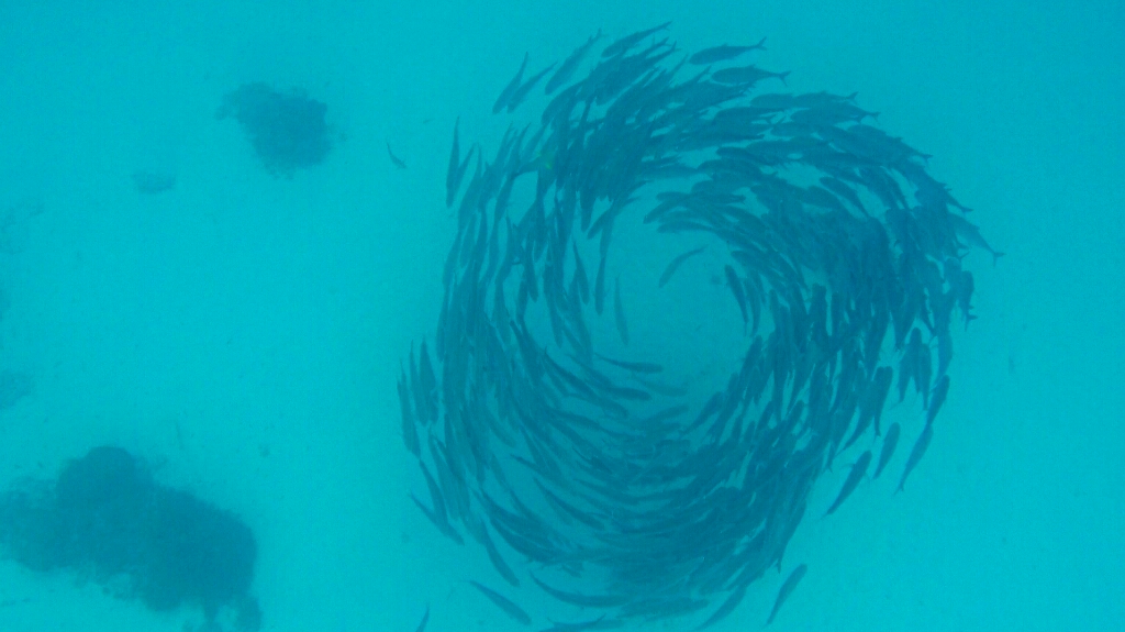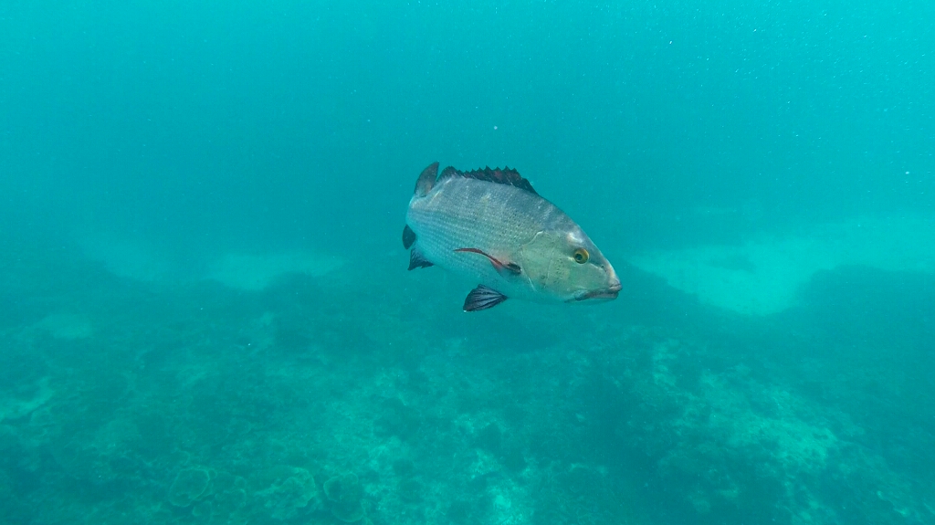 Kaum drin, keine 5min sind vergangen, sehe ich bereits den ersten Hai! Ich habe keine Angst vor denen, denn sie haben Angst vor mir 😀 Leider.. denn die schwimmen schnell davon wenn sie mich bemerken, so dass man den tollen Moment nur kurz geniessen kann. Dieser Pfad dauert etwas mehr als eine Stunde, wenn man mit der Strömung geht. Otherwise länger, wenn man überhaupt auf diese Idee kommt 😀 Das Wasser zwischen den beiden Riff ist zwischen 5 und 10m tief und so sehe ich hier viele grosse Fische. Vorallem die grossen Papageienfische sind cool, voller Farben! Manche Fische sind so gross (1.5m bis zu 2m) und ziemlich wuchtig, so dass ich im ersten Moment ehrlich gesagt fast ein bisschen Angst hatte 😀 Eine Spezielle davon hat einen richtig bösen Blick, wenn man sie von vorne her anschaut. Die habe ich nie gerne gesehen 😀 Der erste Schnorchelgang war auf alle Fälle ein Erfolg! Am Abend lerne ich ein nettes Pärchen aus Canberra kennen. Er Jorunalist und sie arbeitet im öffentlichen Dienst und so habe ich auch schon einen Buddy für den nächsten Tag gefunden 🙂