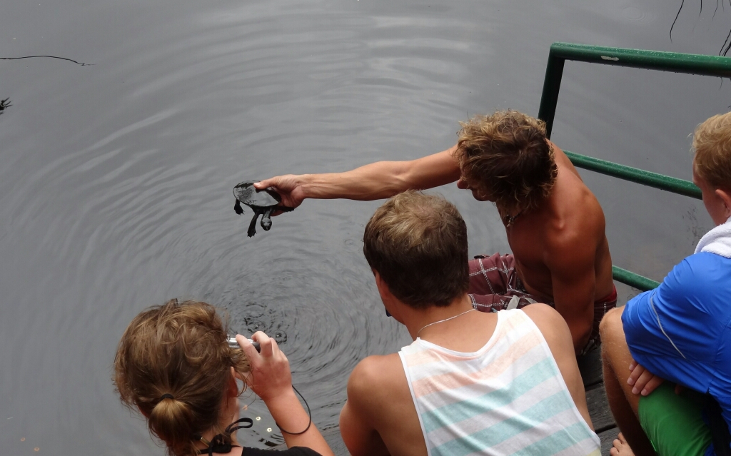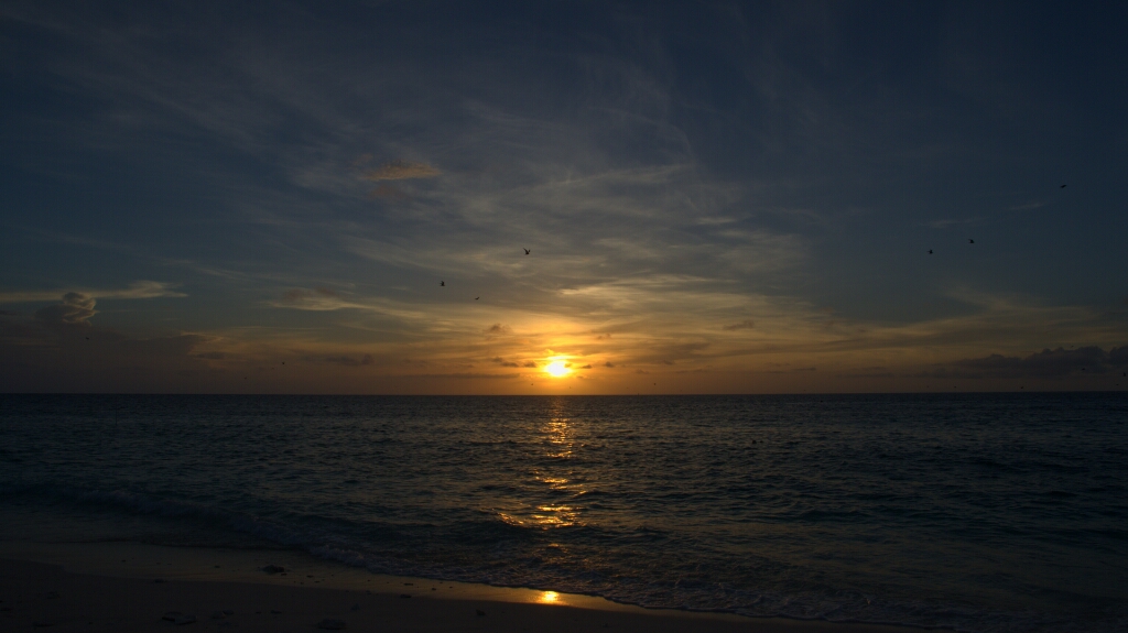 Am Abend nach dem strengen Schnorcheltag gönne ich mir ein Bier an der Bar und habe mit zwei Holländern gute Gesellschaft 😀 Der eine Holländer ist Taucher und jammert dass er noch keinen Mantarochen beim Tauchen gesehen hat. Als hätte ich heute nicht schon genug erlebt, taucht plötzlich eine Dame auf und fragt ob wir helfen können. Draussen irren ein paar junge Schildkröten herum. Diese haben den Weg vom Nest zum Meer nicht gefunden und watscheln auf Ressortspfaden ums Licht herum. Wir sammeln sie ein – es waren nur vier – und legen sie an den Strand, so dass sie zum Meer watscheln können bis der nächste Wellengang sie in die Freiheit befördert 😀