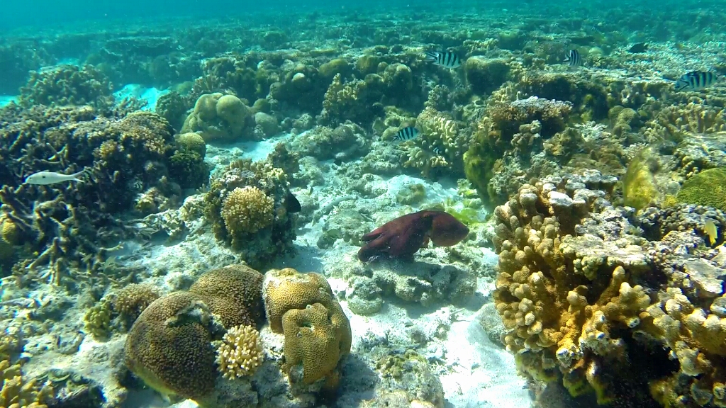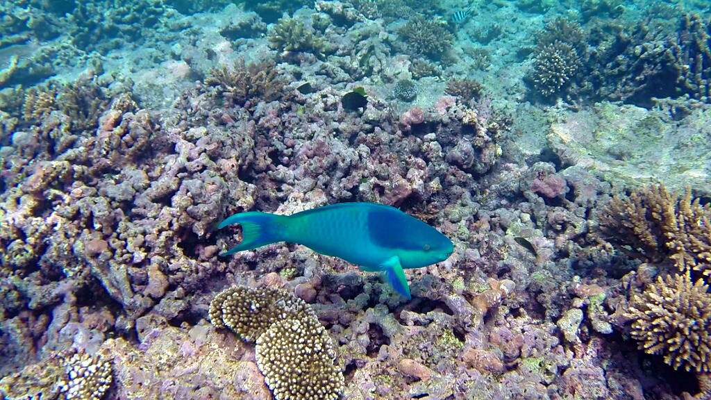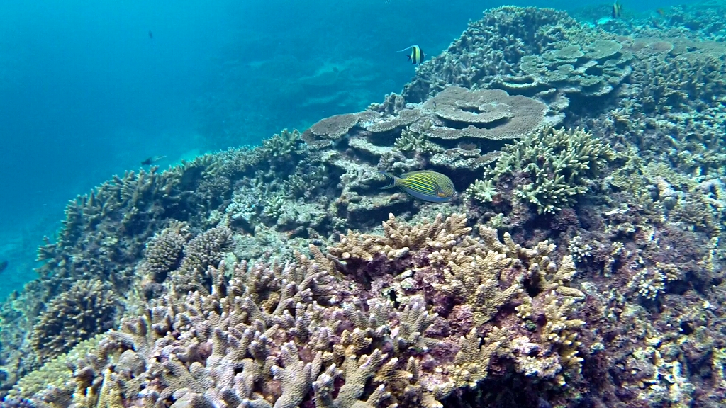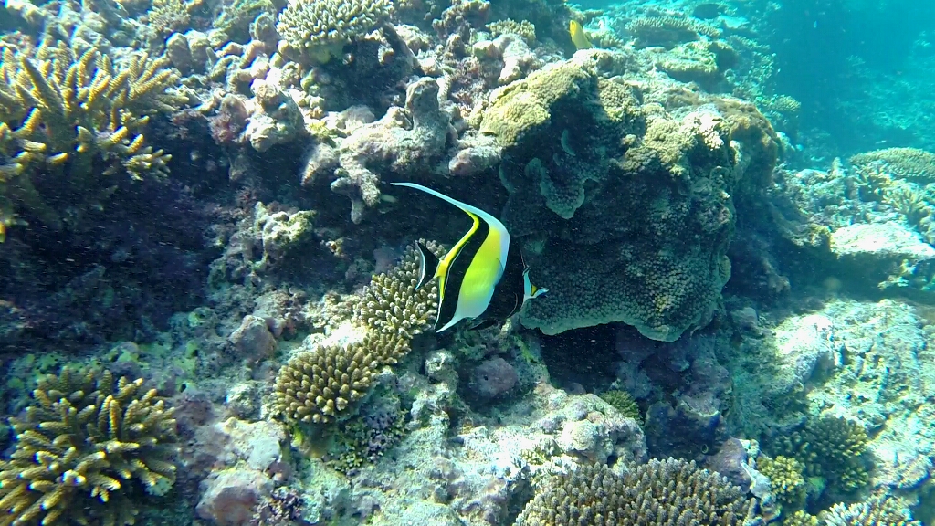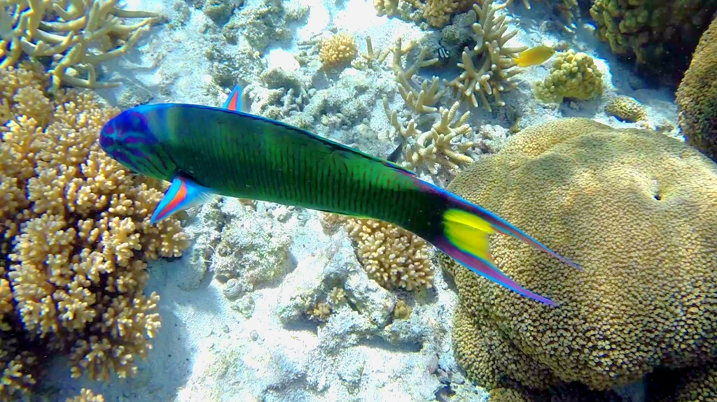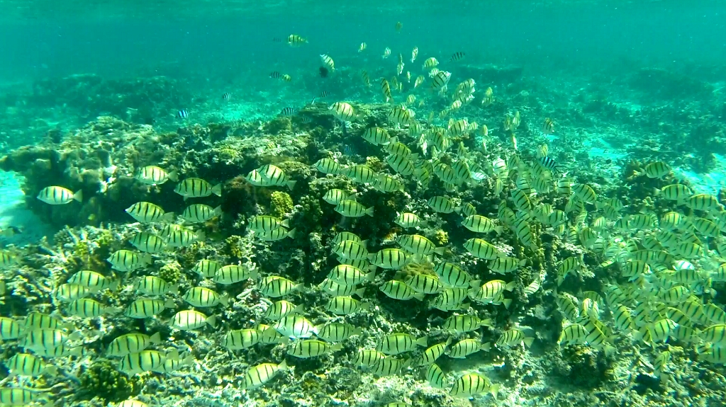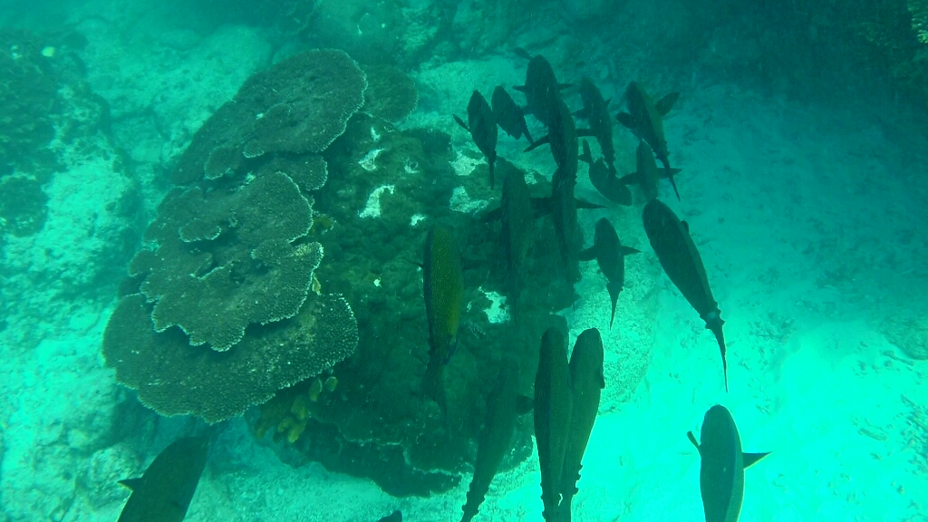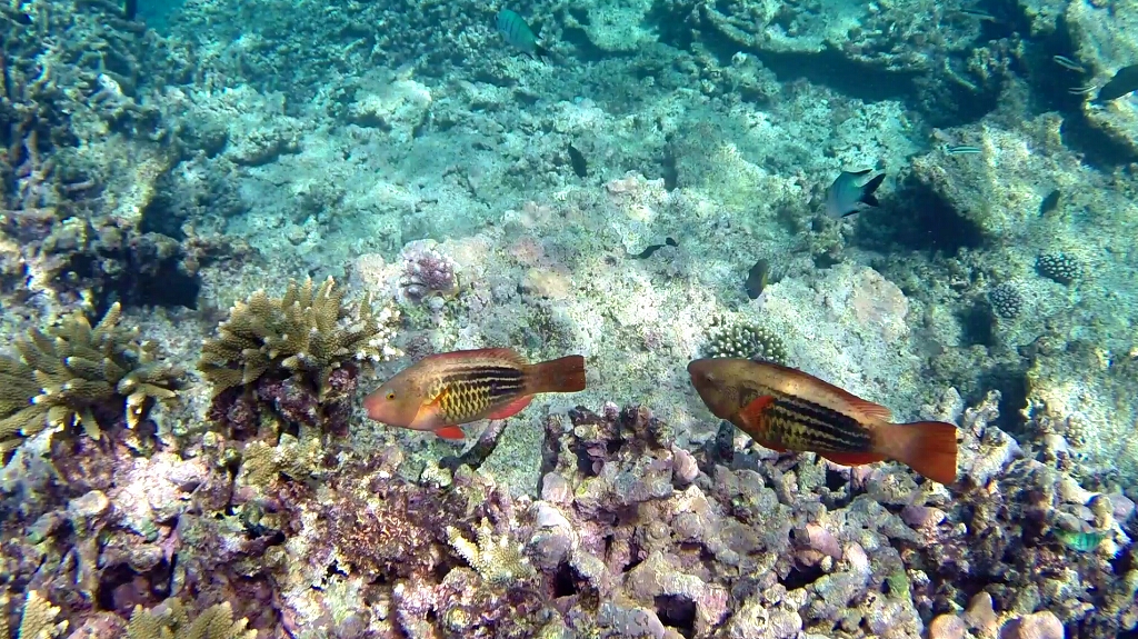 Es gibt im Prinzip drei Schnorchelpfade auf dieser Insel. An der Ostseite in der Lagune, wo die Korallen bei Low Tide aus dem Wasser ragen. Dort kann man nur zwischen +/-2h von High Tide schnorkeln. An der Westküste gibt es einen ersten und zweiten Riff. Ein Pfad geht zwischen den ersten beiden Riff hindurch, der andere ausserhalb des zweiten Riffs. Dort ist quasi das offene Meer und relativ tief (20m). Auf dieser Seite kann man immer schnorcheln, allerdings muss man vorher checken, wie die Strömung ist. Und es gibt nur zwei Stellen, wo man rein und wieder raus aus dem Wasser gehen kann/darf – im Norden „Coral Garden“ und im Süden „Lighthouse“. Grundsätzlich sollte man hier nicht alleine schnorcheln, sondern immer ein Buddy dabei haben. Was für mich jetzt nicht gerade einfach ist. Aber nach einem gründlichen Gespräch im Dive Shop sind wir zum Schluss gekommen, dass es im Moment genügend Leute und auch Boote unterwegs sind. So dass es für mich kein Problem ist, ohne einem Buddy zu gehen. Also, die Leute sind informiert, jetzt gehts ab zur Westseite um zwischen den beiden Riffs zu schnorcheln, am äussrem Riff war es mir dann doch zu heikel 😉