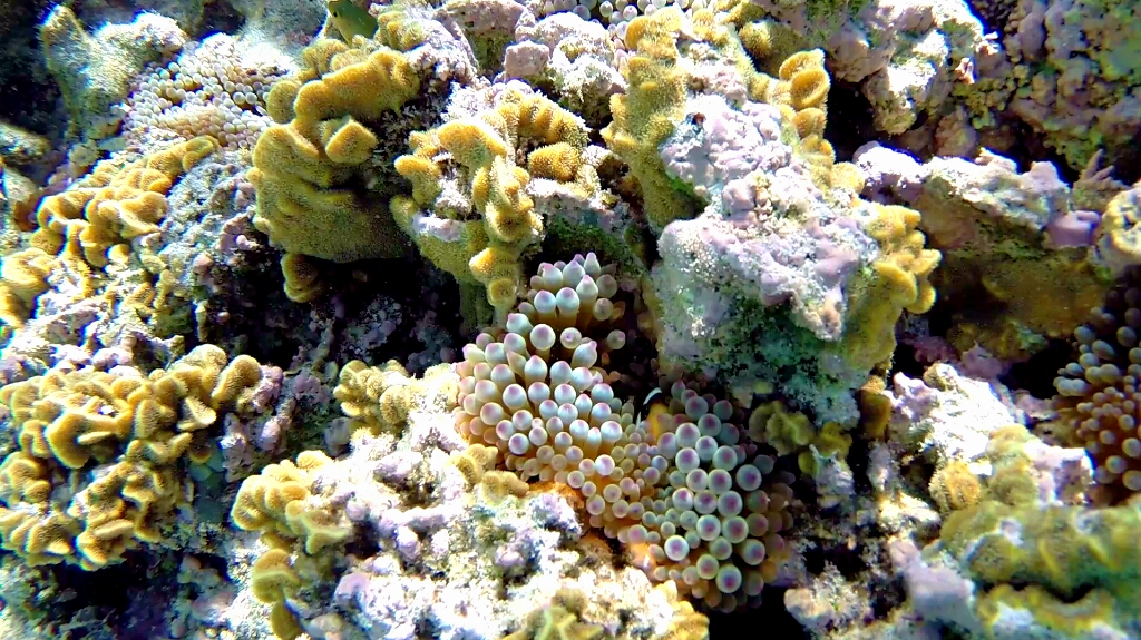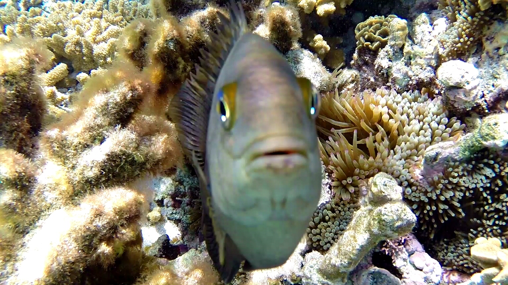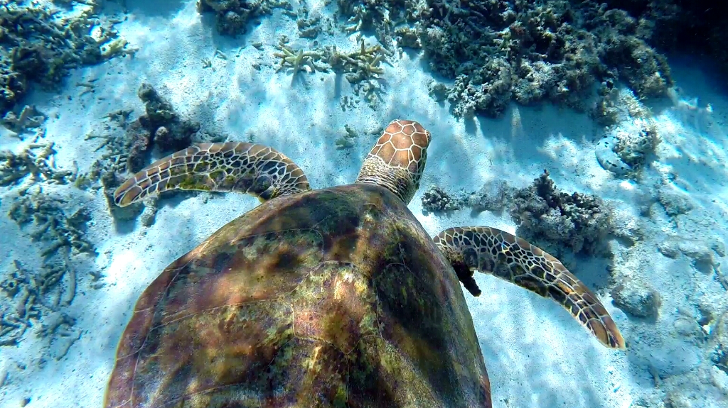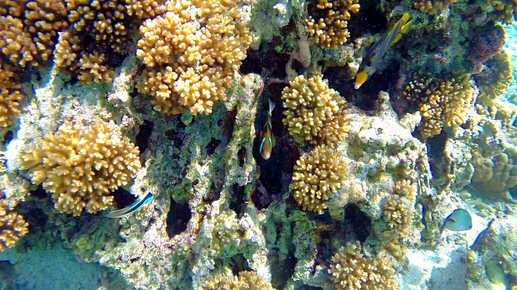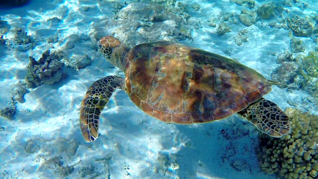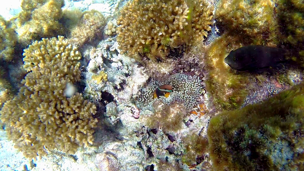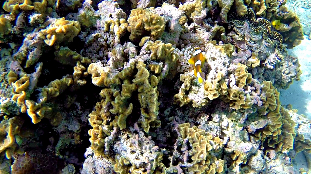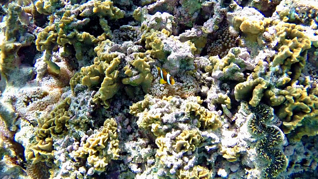 Tag 2: In dieser teuren Übernachtung ist wenigstens das Frühstücks- und Dinner-Buffet inbegriffen. So dass ich ordentlich zuschlagen kann 😀 Ja die Energiezufuhr ist wichtig, denn schnorcheln kann hier recht anstrengend sein. An diesem morgen gehts zuerst auf Eastside, weil dort gerade High Tide und optimal zum Schnorcheln ist. Das Wasser ist hier nur zwischen 1-2m tief und extremst klar. Wow. Da hat man den Durchblick 😀 Und hier bekomme ich zu Gesicht, worauf ich seehnlichst lange gewartet habe und ich ehrlich gesagt nicht mehr daran glaubte je auf meiner Reise zu finden: Den Clark’s Anemonenfish. Du kennst diesen Fisch nicht??? Nicht schlimm, ich wusste auch lange nicht wie der Clownfisch Nemo im richtigen Namen heisst 😀 Die sind echt putzig und so scheu, dass sie sich sofort in den Seeanemonen verstecken wenn sie dich sehen 😀 Dann weiter draussen taucht eine Schildkröte auf, dann noch einer und noch einer, und plötzlich war ich in mitten einer Gruppe von etwa 15 Wasserschildkröten 😯 Ich habe damals im Ningaloo Reef bereits einzelne Schildkröten gesehen. Aber diese hier sind mindestens doppelt so gross und soo viele 😯 Echt geil!