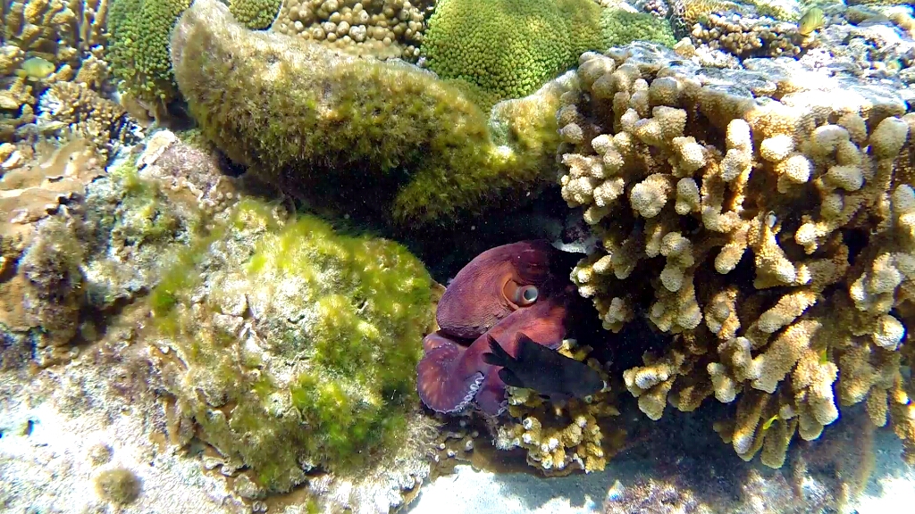 Tag 3: An diesem Morgen schlage ich beim Frühstück wieder ordentlich zu, ihr hättet die Blicke des Pärchen aus Canberra sehen sollen 😀 Ich habe schliesslich noch zwei weitere Schnorchelgänge auf dem Programm. Zuerst East Side, da bis 11am High Tide ist. Und ohne irgendwelche Erwartungen gehts rein ins Wasser und schwimme bis zur Stelle wo ich gestern die Horde Schildkröten gesehen habe. Leider sehe ich nur noch einen. Wo sind die alle hin? However, dafür entdecke ich plötzlich einen Oktopus der gerade vom einen Riffgestein zum anderen rüber zieht. Erst bin ich ziemlich erschrocken, die sehen ja nicht gerade schön aus 😀 Aber die Freude ist dann gross, weil es der erste Oktopus ist, den ich sehe 🙂 Nach und nach entdecke ich weitere solche. Aber man muss gut hinschauen, denn sie können sich gut mit der Farbe und Form des Riffs tarnen. Nach diesem Schnorchelgang gehts nun direkt auf die andere Seite der Insel. Es gibt nur noch etwas, was ich beim Schnorcheln noch nicht gesehen habe: Mantarochen. Jetzt heisst es zum offenen Meer rausschwimmen, wo es unheimlich tief wird, aber das Wasser so klar ist, dass man bis auf den Boden runter sieht. Wellengang ca. 1m. Strömung nordwärts entlang des Strandes. Wassertemperatur 26°C. Nach etwa 20min bin da, wo die Mantarochen sein sollten. Ausser Sand und ein paar Riffgesteine sehe ich hier nichts. 5min warte ich da und suche…. Plötzlich aus dem Nichts taucht einen RIESEN Mantarochen auf. Das Gefühl so ein putziges Tier 20m unter dir zu sehen ist einfach unbeschreiblich 😀 Dieser Mantarochen ist ca. 4-5m breit. Sicher 10min habe ich diesen beobachtet, wie er in aller Ruhe umherkreist und sich hinter den kleinen Fische her macht 🙂 Dann musste ich das Spektakel verlassen und weitere 30min gegen die seitliche Strömung zurück schwimmen. Mit dem Gefúhl der vollen Erfüllung nehme ich noch den letzten Lunch auf der Insel, bevor es dann wieder zurück nach Bundaberg fliegts!